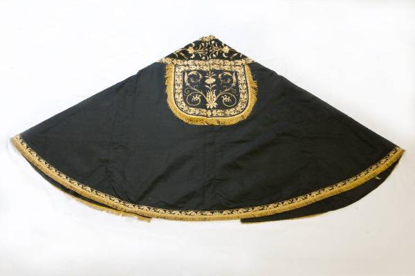 Piviali in cannellato nero. Il ricamo in oro filato e oro laminato si sviluppa lungo lo stolone e nel cappuccio. Nello stolone il disegno si snoda dal basso verso l'alto con coppie di tralci affrontati che allargandosi e ricongiugendosi danno origine a foglie d'acanto, girali, gigli e peonie; nel cappuccio è ricamata una sola coppia di tralci affrontati che allargandosi da' origine a foglie d'acanto e a una peonia. I bordi dello stolone, del cappuccio e della veste sono rifiniti da fregi dorati con foglie d'acanto affrontate che visivamente sostituiscono l'applicazione del gallone. Fodera in tessuto di seta nero.