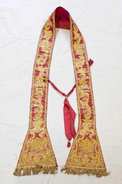 Stola in raso rosso. Il ricchissimo ricamo, eseguito in oro filato e oro laminato con applicazione di paillettes, assume un'ampia struttura centralizzata che occupa tutta la superficie del tessuto. Il disegno si sviluppa dal basso verso l'alto con tralci d'acanto contrapposti e speculari nella direzione che si allargano in ampi girali con fiori e foglie d'acanto. Fodera in tessuto rosso.