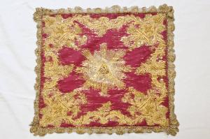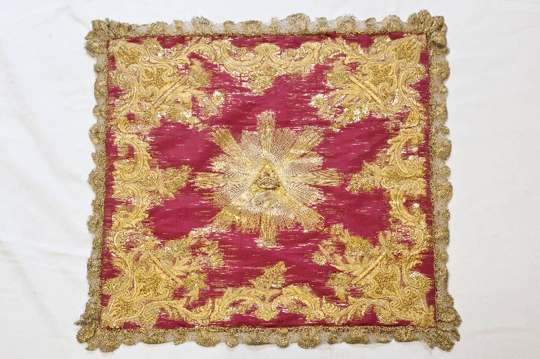 Velo di calice in raso rosso. Il ricchissimo ricamo, eseguito in oro filato e oro laminato con applicazione di paillettes, assume un'ampia struttura centralizzata che occupa tutta la superficie del tessuto. Il disegno si sviluppa lungo il perimetro con canestri di fiori agli angoli dai quali dipartono tralci contrapposti e speculari nella direzione con girali, fiori e foglie d'acanto. Al centro il triangolo con l'occhio divino raggiato d'oro. Fodera in tessuto rosso. Galloni in oro filato e oro laminato eseguiti a fuselli.