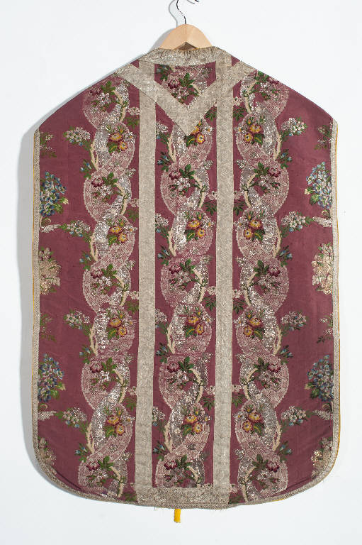 Pianeta in tessuto cannellato viola. Il motivo decorativo, in seta policroma e argento laminato, si sviluppa dal basso verso l'alto e consiste in un nastro trasparente bianco con motivo a pizzo intrecciato a "8" nelle cui anse trovano alloggio mazzolini di fiori policromi. Ai lati, a completare la struttura del disegno, trovano collocazione mazzi di fiori più importanti alternativamente rivolti verso destra e sinistra. Fodera in Gros de Tours di seta giallo. Galloni in argento filato eseguiti a telaio.