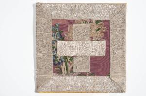 - NOTIZIE STORICO CRITICHE La borsa del corporale in esame, appartenente ad un paramento liturgico, è realizzata in cannellato viola con motivi decorativi broccati. Date le sue dimensioni ridotte, il manufatto risulta mancante di quel nastro trasparente bianco con motivo a pizzo intrecciato a "8", che si sviluppa dal basso verso l'alto, nelle cui anse trovano alloggio mazzolini di fiori policromi. Nel decoro in esame sono presenti solo quei mazzi di fiori più importanti alternativamente rivolti verso destra e sinistra che negli altri pezzi del parato sono collocati ai lati per completare la struttura del disegno. Le dimensioni del nastro e il suo andamento sinuoso portano a datare il tessuto al terzo quarto del Settecento. Verso la fine del secolo, difatti, il motivo a serpentina accompagnato dai soliti bouquets di fiori subirà una stilizzazione e una geometrizzazione delle forme che conferiranno alla composizione quella rigidità qui ancora non presente.