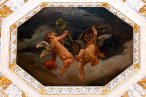 - NOTIZIE STORICO CRITICHE Il dipinto in esame, di forma ottagonale, fa parte di un ciclo di nove tele a olio (num. foto 1228) eseguito da Angelo Maironi nel 1907 (cfr. Archivio della Congregazione della Misericordia Maggiore, Bergamo, "Relazione di restauro", 2000). Raffigura due angioletti in volo tra le nuvole avvolti solo da un panneggio rosso (quello a sinistra) e da uno giallo (quello a destra) che reggono al centro un drappo verde. Collocato al centro della volta della seconda sacrestia, è inserito in una decorazione a stucco realizzata da Lorenzo Porta tra il 1619 e il 1620.\nLe tele sono state restaurate nel 2000 dal Laboratorio A.R.C.O. di M. e P. Virotta in collaborazione con lo studio Ravasio Castellani di Bergamo (cfr. "Relazione di restauro", 2000).