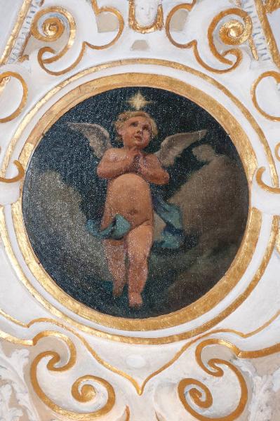- NOTIZIE STORICO CRITICHE Il dipinto in esame, di forma ovale, fa parte di un ciclo di nove tele a olio (num. foto 1228) eseguito da Angelo Maironi nel 1907 (cfr. Archivio della Congregazione della Misericordia Maggiore, Bergamo, "Relazione di restauro", 2000). Raffigura un angioletto in volo tra le nuvole avvolto da un panneggio azzurro con le mani giunte; sopra la sua testa è raffigurata una stella. Collocato in un pennacchio della volta della seconda sacrestia, è inserito in una decorazione a stucco realizzata da Lorenzo Porta tra il 1619 e il 1620.\nLe tele sono state restaurate nel 2000 dal Laboratorio A.R.C.O. di M. e P. Virotta in collaborazione con lo studio Ravasio Castellani di Bergamo (cfr. "Relazione di restauro", 2000).