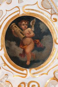 - NOTIZIE STORICO CRITICHE Il dipinto in esame, di forma ovale, fa parte di un ciclo di nove tele a olio (num. foto 1228) eseguito da Angelo Maironi nel 1907 (cfr. Archivio della Congregazione della Misericordia Maggiore, Bergamo, "Relazione di restauro", 2000). Raffigura un angioletto in volo tra le nuvole avvolto da un panneggio bordeaux e arancio che regge tra le mani una torre merlata. Collocato sul lato destro della volta della seconda sacrestia, è inserito in una decorazione a stucco realizzata da Lorenzo Porta tra il 1619 e il 1620.\nLe tele sono state restaurate nel 2000 dal Laboratorio A.R.C.O. di M. e P. Virotta in collaborazione con lo studio Ravasio Castellani di Bergamo (cfr. "Relazione di restauro", 2000).