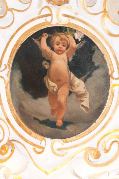- NOTIZIE STORICO CRITICHE Il dipinto in esame, di forma ovale, fa parte di un ciclo di nove tele a olio (num. foto 1228) eseguito da Angelo Maironi nel 1907 (cfr. "Relazione di restauro", 2000). Raffigura un angioletto in volo tra le nuvole avvolto da un panneggio avorio che regge tra le mani alzate una rosa. Collocato sul lato destro della volta della seconda sacrestia, è inserito in una decorazione a stucco realizzata da Lorenzo Porta tra il 1619 e il 1620.\nLe tele sono state restaurate nel 2000 dal Laboratorio A.R.C.O. di M. e P. Virotta in collaborazione con lo studio Ravasio Castellani di Bergamo (cfr. "Relazione di restauro", 2000).