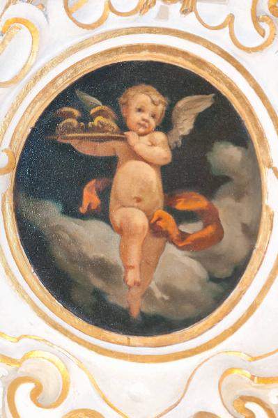- NOTIZIE STORICO CRITICHE Il dipinto in esame, di forma ovale, fa parte di un ciclo di nove tele a olio (num. foto 1228) eseguito da Angelo Maironi nel 1907 (cfr. Archivio della Congregazione della Misericordia Maggiore, Bergamo, "Relazione di restauro", 2000). Raffigura un angioletto in volo tra le nuvole avvolto da un panneggio arancio con sfumature bordeaux che regge un vassoio con pani, forse un riferimento eucaristico. Collocato in un pennacchio della volta della seconda sacrestia, è inserito in una decorazione a stucco realizzata da Lorenzo Porta tra il 1619 e il 1620.\nLe tele sono state restaurate nel 2000 dal Laboratorio A.R.C.O. di M. e P. Virotta in collaborazione con lo studio Ravasio Castellani di Bergamo (cfr. "Relazione di restauro", 2000).