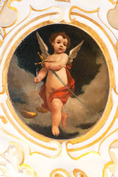 - NOTIZIE STORICO CRITICHE Il dipinto in esame, di forma ovale, fa parte di un ciclo di nove tele a olio (num. foto 1228) eseguito da Angelo Maironi nel 1907 (cfr. Archivio della Congregazione della Misericordia Maggiore, Bergamo, "Relazione di restauro", 2000). Raffigura un angioletto in volo tra le nuvole avvolto da un panneggio rosso con sfumature bordeaux che tiene tra le mani una bilancia e una spada. Collocato sul lato sinistro della volta della seconda sacrestia, è inserito in una decorazione a stucco realizzata da Lorenzo Porta tra il 1619 e il 1620.\nLe tele sono state restaurate nel 2000 dal Laboratorio A.R.C.O. di M. e P. Virotta in collaborazione con lo studio Ravasio Castellani di Bergamo (cfr. "Relazione di restauro", 2000).