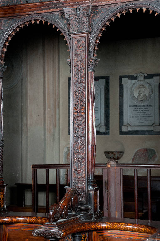 Pilastrino intagliato sulle due facce principali con motivi a candelabra nei quali, tra i racemi vegetali, si alternano vasi, il busto di una figura, uccelli affrontati, un cherubino, teste di delfino affrontate, fenicotteri e in alto una fenice che brucia (faccia verso l'interno del coro), vasi, cherubino e papaveri in alto (faccia verso l'esterno); i capitelli sulle due facce sono di tipo composito con foglie di acanto e un cherubino sul calato, volute, foglie accartocciate e fiori sull'echino; sulle facce minori, interne alle bifore, sono addossate due semicolonne scanalate e rudentate.
