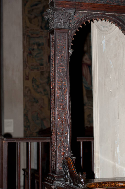 - NOTIZIE STORICO CRITICHE Il pilastrino fa parte dell'iconostasi del coro commissionato nel 1522 dal Consorzio della Misericordia Maggiore di Bergamo al legnaiolo e intarsiatore loverese Giovanni Francesco Capoferri, al quale, alla fine di ottobre, fu affiancato il marangone Giovanni Belli di Ponteranica per i lavori di intaglio. Il progetto della struttura del coro fu messo a punto dallo stesso Capoferri che visitò varie città del Nord-Italia per vedere altri cori intarsiati e che nel luglio-agosto 1523 si recò più volte a Milano dal pittore e architetto trevigliese Bernardo Zenale per sottoporgli il modello del coro. I cartoni delle tarsie figurative che ornano il coro furono affidate in un primo momento (29 ottobre 1523) al poco noto pittore bergamasco Nicolino Cabrini che morì poco dopo: il 12 marzo 1524 fu incaricato al suo posto Lotto, a cui il 2 giugno 1524 il Consorzio richiese anche i pannelli intarsiati ("coperti") che dovevano proteggere le preziose tavolette, i cui soggetti dovevano essere indicati dal principale teologo della città, fra Girolamo Terzi.\nLa struttura del coro è in legno di noce, salvo l'ossatura in legno di conifera. I primi acquisti di legname risalgono al 1523 (cfr. il "Liber fabrice Chori"): insieme al giovanissimo figlio Alessandro, l'intagliatore Giovanni Belli realizzò gran parte della struttura e in particolare i sedili, i pilastrini, le arcate delle porte, l'architrave e il cornicione, piedistalli per i sedili e piccoli piedistalli per le colonne, cornici di varia misura anche per i quadri intarsiati. I Belli furono coadiuvati da altri intagliatori, come Alvise da Prezzate per la tornitura delle colonnine dei sedili e delle bifore e per le rosette dei sottarchi (1525-1531), Donato Prestinari di Alzano Superiore col figlio Pietro per i pilastrini, i capitelli delle lesene e i piccoli pennacchi delle bifore (1524, 1527-1528), Pietro Bussolo per i braccioli dei sedili (1525), Alselmo Cortesi di Villa di Serio, Clemente Tortelli di Chiari ancora per i capitelli delle lesene (1525), Giacomo Alberti di Villa di Serio per gli intagli dell'iconostasi, delle sedie e delle porte. Quasi tutti i disegni dei fregi, dei rilievi intagliati e nelle tarsie minori presenti nelle varie parti del coro furono allogati nel dicembre 1524 al pittore Domenico Petengi d'Albano. Le tre porte lignee di accesso al presbiterio furono eseguite da Giovanni Belli nel 1529-1530, mentre i tondi con le Storie di Maria nei pennacchi di esse, disegnati nel 1530 dal pittore Lucano da Imola, furono intagliati dal Alessandro Belli e da Giacomo Alberti nel 1530-1531. Un certo Sebastiano da Almenno tornì le cornici tornite delle tre arcate. Alla morte di Giovanni Belli nel 1530 i lavori strutturali e di intaglio erano sostanzialmente finiti, salvo alcuni ulteriori interventi di completamento che sarebbero stati ultimati nel gennaio 1532.\nNel 1531 fu deciso di ampliare la struttura del coro, trasferendo le tarsie istoriate del coro degli ecclesiastici ai due bancali dei celebranti e dei Rettori e al coro dei laici nell'abside: nel coro degli ecclesiastici rimasero i soli 'coperti' di soggetto simbolico. Nell'ottobre del 1533, consegnati dal Capoferri gli ultimi pannelli intarsiati, risultano già collocate negli stalli del coro dei religiosi le tarsie 'simboliche' degli ex-coperti, mentre le altre tarsie istoriate sarebbero rimaste per vent'anni nei depositi della Misericordia Maggiore.