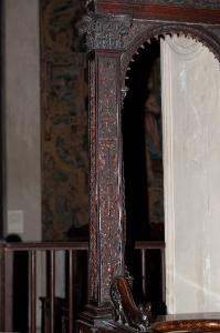 Pilastrino intagliato su tre facce con motivi a candelabra nei quali, tra i racemi vegetali, si alternano un vaso, uno stemma, una coppia di fanciulli reggidrappo, un candelabro a sette bracci (faccia verso l'interno del coro), un piedistallo, vasi, una testa di putto (faccia sotto la porta), una figura femminile e putti (faccia verso la navata); il capitello a tre facce è di tipo composito con foglie di acanto sul calato, volute e foglie sull'echino, fiori e un mascherone sull'echino; sulla faccia interna alla bifora è addossata una semicolonna scanalata e rudentata a tortiglione.