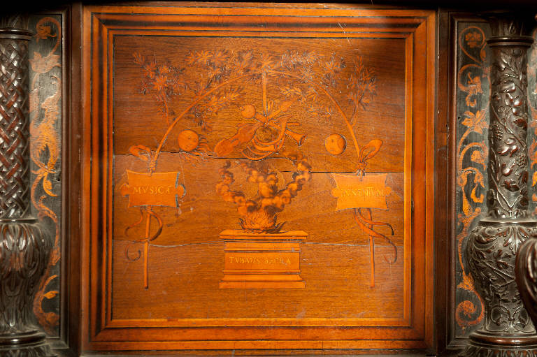 - NOTIZIE STORICO CRITICHE Nel 1522 il Consorzio della Misericordia Maggiore di Bergamo decise di dotare la basilica di Santa Maria di un nuovo coro confacente alla progettata pala d'argento e rame dell'altare maggiore e il 18 settembre di quell'anno deliberò di trattare con il legnaiolo e intarsiatore loverese Giovanni Francesco Capoferri per l'esecuzione dell'opera. L'artefice era noto a Bergamo fin dall'anno precedente per aver collaborato con fra' Damiano Zambelli all'esecuzione del coro intarsiato nella chiesa domenicana di Santo Stefano (ora in San Bartolomeo), inoltre il pittore Lorenzo Lotto gli aveva fatto tradurre in tarsia un suo disegno dell'Annunciazione (poi inserita nel bancale del celebrante, cfr. foto n. 904a) e questa dimostrazione aveva convinto il Consorzio ad affidare il lavoro al loverese. Al Capoferri, direttore dell'impresa del coro, fu affiancato il marangone Giovanni Belli di Ponteranica per i lavori di intaglio. Il principale teologo della città, fra Girolamo Terzi, fu incaricato di fornire le "inventiones" da dare ai pittori che avrebbero disegnato i cartoni da intarsiare. Il progetto della struttura del coro fu messo a punto dallo stesso Capoferri che visitò varie città del Nord-Italia per vedere altri cori intarsiati e che nel luglio-agosto 1523 si recò più volte a Milano dal pittore e architetto trevigliese Bernardo Zenale per sottoporgli il modello del coro. \nDopo aver acquisito alcuni cartoni forniti da pittori diversi, tra cui Lotto, Andrea Previtali, Francesco Rosso di Pavia, il 29 ottobre 1523 il Consorzio affidò i cartoni delle tarsie del coro al pittore bergamasco Nicolino Cabrini, di cui non si conosce nessuna opera se non la profilatura di alcune tarsie e che morì poco dopo, nel gennaio del 1524. Il 12 marzo 1524 il Consorzio incaricò dunque Lorenzo Lotto di eseguire i disegni per le tarsie da inserire negli schienali del coro ligneo della chiesa; dopo pochi mesi (2 giugno 1524) gli commissionò anche i pannelli intarsiati ("coperti") che dovevano proteggere le preziose tavolette. Le tarsie principali sarebbero state policrome, mentre i coperti a monocromo: questi ultimi avrebbero avuto come ornamento immagini simboliche in relazione coi contenuti delle "storie" da proteggere. Lotto inizialmente effettuò anche la 'profilatura' delle tarsie, ovvero la loro rifinitura finale mediante stucco nero per i contorni delle figure e con ombreggiatura a fuoco per il chiaro-scuro, ma un contrasto di natura economica frenò la sua disponibilità: il Consorzio gli riconobbe un compenso maggiore per le tarsie grandi dell'iconostasi. La profilatura fu allora effettuata dallo stesso Capoferri e dai pittori Andrea Previtali, Ludovico da Mantova e Lucano da Imola. Trasferitosi a Venezia nel dicembre del 1525, il pittore continuò a disegnare i cartoni delle tarsie e a inviarle a Bergamo fino al 1532, realizzando complessivamente 35 tarsie con storie bibliche di cui 4 grandi per l'iconostasi e 31 più piccole collocate oggi negli stalli del coro dei laici e nei due bancali del presbiterio; inoltre eseguì 32 tarsie a soggetto simbolico delle quali 28 costituivano i "coperti" delle tarsie istoriate e che oggi sono inserite negli schienali del coro degli ecclesiastici. \nNel 1531 si decise di ampliare la struttura del coro, trasferendo le tarsie istoriate ai due bancali dei celebranti e dei Rettori e al coro dei laici nell'abside, mentre nel coro degli ecclesistici rimasero i soli 'coperti' di soggetto simbolico. Solo i grandi quadri istoriati nel fronte dell'iconostasi rimasero con i loro coperti nella collocazione originaria. Nell'ottobre del 1533, consegnati dal Capoferri gli ultimi pannelli intarsiati, risultano già collocate negli stalli del coro dei religiosi le tarsie 'simboliche' degli ex-coperti, mentre le altre tarsie istoriate sarebbero rimaste per vent'anni nei depositi della Misericordia Maggiore.\nLa tarsia in oggetto, pensata come coperto della tarsia con "Tubal" (poi inserita nel bancale del celebrante a sinistra), fu disegn