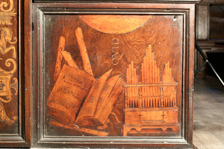 - NOTIZIE STORICO CRITICHE Nel 1522 il Consorzio della Misericordia Maggiore di Bergamo decise di dotare la basilica di Santa Maria di un nuovo coro confacente alla progettata pala d'argento e rame dell'altare maggiore e il 18 settembre di quell'anno deliberò di trattare con il legnaiolo e intarsiatore loverese Giovanni Francesco Capoferri per l'esecuzione dell'opera. L'artefice era noto a Bergamo fin dall'anno precedente per aver collaborato con fra' Damiano Zambelli all'esecuzione del coro intarsiato nella chiesa domenicana di Santo Stefano (ora in San Bartolomeo), inoltre il pittore Lorenzo Lotto gli aveva fatto tradurre in tarsia un suo disegno dell'Annunciazione (poi inserita nel bancale del celebrante, cfr. foto n. 904a) e questa dimostrazione aveva convinto il Consorzio ad affidare il lavoro al loverese. Al Capoferri, direttore dell'impresa del coro, fu affiancato il marangone Giovanni Belli di Ponteranica per i lavori di intaglio. Il principale teologo della città, fra Girolamo Terzi, fu incaricato di fornire le "inventiones" da dare ai pittori che avrebbero disegnato i cartoni da intarsiare. Il progetto della struttura del coro fu messo a punto dallo stesso Capoferri che visitò varie città del Nord-Italia per vedere altri cori intarsiati e che nel luglio-agosto 1523 si recò più volte a Milano dal pittore e architetto trevigliese Bernardo Zenale per sottoporgli il modello del coro. \nDopo aver acquisito alcuni cartoni forniti da pittori diversi, tra cui Lotto, Andrea Previtali, Francesco Rosso di Pavia, il 29 ottobre 1523 il Consorzio affidò i cartoni delle tarsie del coro al pittore bergamasco Nicolino Cabrini, di cui non si conosce nessuna opera se non la profilatura di alcune tarsie e che morì poco dopo, nel gennaio del 1524. Il 12 marzo 1524 il Consorzio incaricò dunque Lorenzo Lotto di eseguire i disegni per le tarsie da inserire negli schienali del coro ligneo della chiesa; dopo pochi mesi (2 giugno 1524) gli commissionò anche i pannelli intarsiati ("coperti") che dovevano proteggere le preziose tavolette. Le tarsie principali sarebbero state policrome, mentre i coperti a monocromo: questi ultimi avrebbero avuto come ornamento immagini simboliche in relazione coi contenuti delle "storie" da proteggere. Lotto inizialmente effettuò anche la 'profilatura' delle tarsie, ovvero la loro rifinitura finale mediante stucco nero per i contorni delle figure e con ombreggiatura a fuoco per il chiaro-scuro, ma un contrasto di natura economica frenò la sua disponibilità: il Consorzio gli riconobbe un compenso maggiore per le tarsie grandi dell'iconostasi. La profilatura fu allora effettuata dallo stesso Capoferri e dai pittori Andrea Previtali, Ludovico da Mantova e Lucano da Imola. Trasferitosi a Venezia nel dicembre del 1525, il pittore continuò a disegnare i cartoni delle tarsie e a inviarle a Bergamo fino al 1532, realizzando complessivamente 35 tarsie con storie bibliche di cui 4 grandi per l'iconostasi e 31 più piccole collocate oggi negli stalli del coro dei laici e nei due bancali del presbiterio; inoltre eseguì 32 tarsie a soggetto simbolico delle quali 28 costituivano i "coperti" delle tarsie istoriate e che oggi sono inserite negli schienali del coro degli ecclesiastici. \nNel 1531 si decise di ampliare la struttura del coro, trasferendo le tarsie istoriate ai due bancali dei celebranti e dei Rettori e al coro dei laici nell'abside, mentre nel coro degli ecclesistici rimasero i soli 'coperti' di soggetto simbolico. Solo i grandi quadri istoriati nel fronte dell'iconostasi rimasero con i loro coperti nella collocazione originaria. Nell'ottobre del 1533, consegnati dal Capoferri gli ultimi pannelli intarsiati, risultano già collocate negli stalli del coro dei religiosi le tarsie 'simboliche' degli ex-coperti, mentre le altre tarsie istoriate sarebbero rimaste per vent'anni nei depositi della Misericordia Maggiore.\nLa tarsia in oggetto fu ideata da Lotto entro il dicembre 1525 a completamento della serie di quattro piedistalli presso le porte,