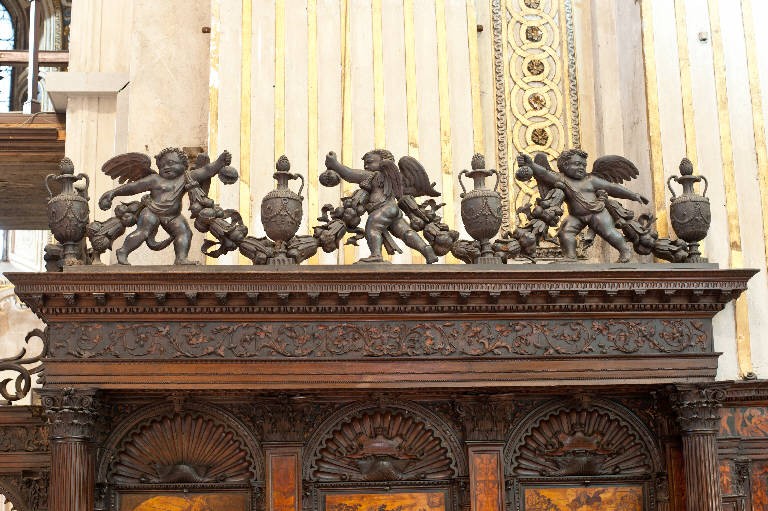 Cimasa ad alto rilievo scolpita "a giorno" con angioletti reggifestone alternati a vasi