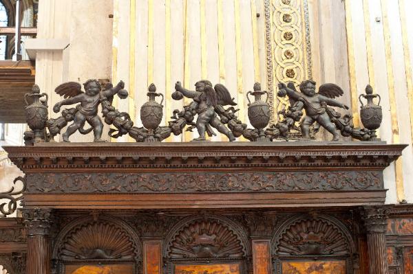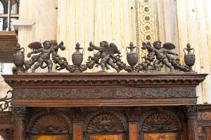 - NOTIZIE STORICO CRITICHE Nel 1522 il Consorzio della Misericordia Maggiore di Bergamo decise di dotare la basilica di Santa Maria di un nuovo coro e il 18 settembre di quell'anno deliberò di trattare con il legnaiolo e intarsiatore loverese Giovanni Francesco Capoferri per l'esecuzione dell'opera. L'artefice era noto a Bergamo fin dall'anno precedente per aver collaborato con fra' Damiano Zambelli all'esecuzione del coro intarsiato nella chiesa domenicana di Santo Stefano (ora in San Bartolomeo), inoltre nel 1522 il pittore Lorenzo Lotto gli aveva fatto tradurre in tarsia un suo disegno dell'Annunciazione (poi inserita nel bancale del celebrante, cfr. foto n. 904a) e questa dimostrazione aveva convinto il Consorzio ad affidare il lavoro al loverese. Al Capoferri, direttore dell'impresa del coro, fu affiancato il marangone Giovanni Belli di Ponteranica per i lavori di intaglio. Il principale teologo della città, fra Girolamo Terzi, fu incaricato di fornire le "inventiones" da dare ai pittori che avrebbero disegnato i cartoni da intarsiare.\nDopo aver acquisito alcuni cartoni forniti da pittori diversi, tra cui Lotto, Andrea Previtali, Francesco Rosso di Pavia, il 29 ottobre 1523 il Consorzio affidò i cartoni delle tarsie del coro al pressoché sconosciuto Nicolino Cabrini, che morì poco dopo. Il 12 marzo 1524 il Consorzio incaricò dunque Lorenzo Lotto di eseguire i disegni per le tarsie e dopo pochi mesi (2 giugno 1524) gli commissionò anche i pannelli intarsiati ("coperti") con imprese simboliche che dovevano proteggere le preziose tavolette. Lotto inizialmente effettuò anche la 'profilatura' delle tarsie, ovvero la loro rifinitura finale mediante stucco nero per i contorni delle figure e con ombreggiatura a fuoco per il chiaro-scuro, ma un contrasto di natura economica frenò la sua disponibilità. La profilatura fu allora effettuata dallo stesso Capoferri e dai pittori Andrea Previtali, Ludovico da Mantova e Lucano da Imola. Trasferitosi a Venezia nel dicembre del 1525, il pittore continuò a disegnare i cartoni delle tarsie e a inviarle a Bergamo fino al 1532, realizzando complessivamente 35 tarsie con storie bibliche di cui 4 grandi per l'iconostasi e 31 più piccole collocate oggi negli stalli del coro dei laici e nei due bancali del presbiterio; inoltre eseguì 32 tarsie a soggetto simbolico delle quali 28 costituivano i "coperti" delle tarsie istoriate e che oggi sono inserite negli schienali del coro degli ecclesiastici. \nNel 1531 si decise di ampliare la struttura del coro, trasferendo le tarsie istoriate del coro degli ecclesiastici al bancale del celebrante, a quello dei Rettori e al coro dei laici nell'abside, mentre nel coro dei religiosi rimasero i soli 'coperti' di soggetto simbolico: dei modelletti delle nuove strutture del presbiterio (bancali e coro dei laici) fu incaricato Marcantonio, figlio dell'architetto Pietro Isabello (1531-1532). Nell'ottobre del 1533, consegnati dal Capoferri gli ultimi pannelli intarsiati, risultano già collocate negli stalli del coro dei religiosi le tarsie 'simboliche' degli ex-coperti, mentre le altre tarsie istoriate rimasero per vent'anni nei depositi della Misericordia Maggiore. La fabbrica del coro fu ripresa nel 1547-1549 ma solo nel 1553-1555 i banchi della cappella maggiore furono portati a termine in base al modello elaborato dall'Isabello: nel 1553 fu chiamato a Bergamo Giovan Pietro Capoferri, fratellastro di Giovan Francesco, affermato intagliatore e intarsiatore, per la realizzazione del bancale del celebrante e della parte sinistra del coro dei laici, mentre ad Alessandro Belli, già attivo col padre nel coro degli ecclesiastici, furono assegnati il bancale dei Rettori e la parte destra del coro dei laici. Nel luglio del 1554 il bancale del celebrante era quasi del tutto intagliato, giacché fu acquistato il noce per la cimasa intagliata da Giovan Pietro Capoferri, che nel 1551-1552 aveva realizzato anche la cimasa intagliata del coro della chiesa di S. Domenico a Bologna. Il pittore Alfonso Capofe