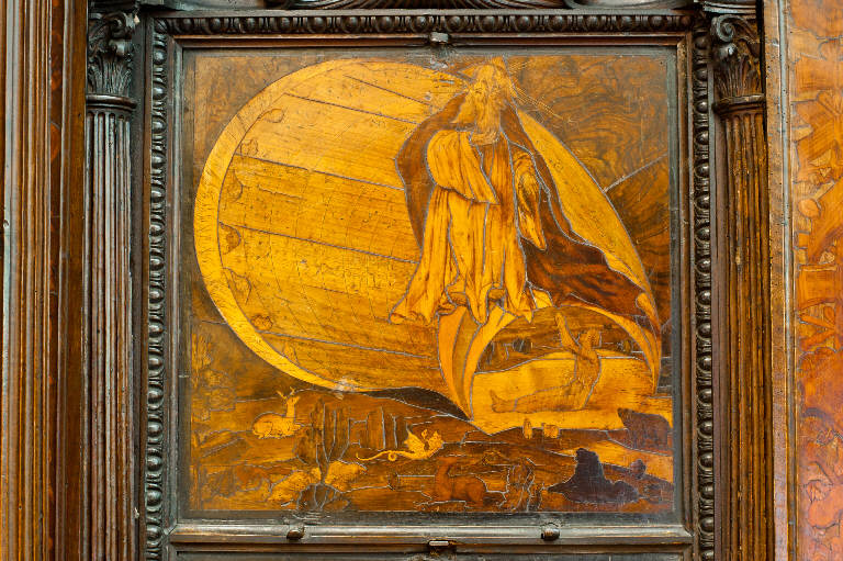 - NOTIZIE STORICO CRITICHE Nel 1522 il Consorzio della Misericordia Maggiore di Bergamo decise di dotare la basilica di Santa Maria di un nuovo coro e il 18 settembre di quell'anno deliberò di trattare con il legnaiolo e intarsiatore loverese Giovanni Francesco Capoferri per l'esecuzione dell'opera. L'artefice era noto a Bergamo fin dall'anno precedente per aver collaborato con fra' Damiano Zambelli all'esecuzione del coro intarsiato nella chiesa domenicana di Santo Stefano (ora in San Bartolomeo), inoltre nel 1522 il pittore Lorenzo Lotto gli aveva fatto tradurre in tarsia un suo disegno dell'Annunciazione (poi inserita nel bancale del celebrante, cfr. foto n. 904a) e questa dimostrazione aveva convinto il Consorzio ad affidare il lavoro al loverese. Al Capoferri, direttore dell'impresa del coro, fu affiancato il marangone Giovanni Belli di Ponteranica per i lavori di intaglio. Il principale teologo della città, fra Girolamo Terzi, fu incaricato di fornire le "inventiones" da dare ai pittori che avrebbero disegnato i cartoni da intarsiare.\nDopo aver acquisito alcuni cartoni forniti da pittori diversi, tra cui Lotto, Andrea Previtali, Francesco Rosso di Pavia, il 29 ottobre 1523 il Consorzio affidò i cartoni delle tarsie del coro al pressoché sconosciuto Nicolino Cabrini, che morì poco dopo. Il 12 marzo 1524 il Consorzio incaricò dunque Lorenzo Lotto di eseguire i disegni per le tarsie e dopo pochi mesi (2 giugno 1524) gli commissionò anche i pannelli intarsiati ("coperti") con imprese simboliche che dovevano proteggere le preziose tavolette. Lotto inizialmente effettuò anche la 'profilatura' delle tarsie, ovvero la loro rifinitura finale mediante stucco nero per i contorni delle figure e con ombreggiatura a fuoco per il chiaro-scuro, ma un contrasto di natura economica frenò la sua disponibilità. La profilatura fu allora effettuata dallo stesso Capoferri e dai pittori Andrea Previtali, Ludovico da Mantova e Lucano da Imola. Trasferitosi a Venezia nel dicembre del 1525, il pittore continuò a disegnare i cartoni delle tarsie e a inviarle a Bergamo fino al 1532, realizzando complessivamente 35 tarsie con storie bibliche di cui 4 grandi per l'iconostasi e 31 più piccole collocate oggi negli stalli del coro dei laici e nei due bancali del presbiterio; inoltre eseguì 32 tarsie a soggetto simbolico delle quali 28 costituivano i "coperti" delle tarsie istoriate e che oggi sono inserite negli schienali del coro degli ecclesiastici. \nNel 1531 si decise di ampliare la struttura del coro, trasferendo le tarsie istoriate del coro degli ecclesiastici al bancale del celebrante, a quello dei Rettori e al coro dei laici nell'abside, mentre nel coro dei religiosi rimasero i soli 'coperti' di soggetto simbolico: dei modelletti delle nuove strutture del presbiterio (bancali e coro dei laici) fu incaricato Marcantonio, figlio dell'architetto Pietro Isabello (1531-1532). Nell'ottobre del 1533, consegnati dal Capoferri gli ultimi pannelli intarsiati, risultano già collocate negli stalli del coro dei religiosi le tarsie 'simboliche' degli ex-coperti, mentre le altre tarsie istoriate rimasero per vent'anni nei depositi della Misericordia Maggiore. La fabbrica del coro fu ripresa nel 1547-1549 ma solo nel 1553-1555 i banchi della cappella maggiore furono portati a termine in base al modello elaborato dall'Isabello: nel 1553 fu chiamato a Bergamo Giovan Pietro Capoferri, fratellastro di Giovan Francesco, affermato intagliatore e intarsiatore, per la realizzazione del bancale del celebrante e della parte sinistra del coro dei laici, mentre ad Alessandro Belli, già attivo col padre nel coro degli ecclesiastici, furono assegnati il bancale dei Rettori e la parte destra del coro dei laici. Nel luglio del 1554 il bancale del celebrante era quasi del tutto intagliato, giacché fu acquistato il noce per la cimasa intagliata da Giovan Pietro Capoferri. Nelle tre spalliere furono inserite sei tarsie disegnate da Lotto e realizzate da Giovan Francesco Capoferri illustranti episodi della