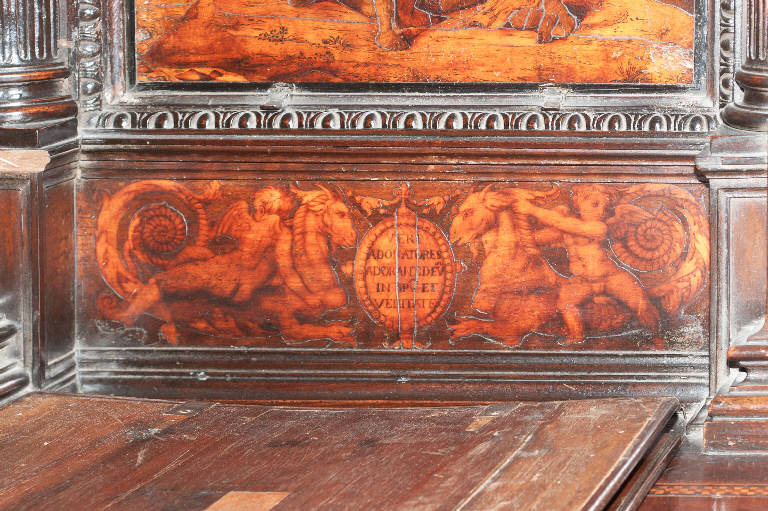 - NOTIZIE STORICO CRITICHE Nel 1522 il Consorzio della Misericordia Maggiore di Bergamo decise di dotare la basilica di Santa Maria di un nuovo coro e il 18 settembre di quell'anno deliberò di trattare con il legnaiolo e intarsiatore loverese Giovanni Francesco Capoferri per l'esecuzione dell'opera. L'artefice era noto a Bergamo fin dall'anno precedente per aver collaborato con fra' Damiano Zambelli all'esecuzione del coro intarsiato nella chiesa domenicana di Santo Stefano (ora in San Bartolomeo), inoltre nel 1522 il pittore Lorenzo Lotto gli aveva fatto tradurre in tarsia un suo disegno dell'Annunciazione (poi inserita nel bancale del celebrante, cfr. foto n. 904a) e questa dimostrazione aveva convinto il Consorzio ad affidare il lavoro al loverese. Al Capoferri, direttore dell'impresa del coro, fu affiancato il marangone Giovanni Belli di Ponteranica per i lavori di intaglio. Il principale teologo della città, fra Girolamo Terzi, fu incaricato di fornire le "inventiones" da dare ai pittori che avrebbero disegnato i cartoni da intarsiare.\nDopo aver acquisito alcuni cartoni forniti da pittori diversi, tra cui Lotto, Andrea Previtali, Francesco Rosso di Pavia, il 29 ottobre 1523 il Consorzio affidò i cartoni delle tarsie del coro al pressoché sconosciuto Nicolino Cabrini, che morì poco dopo. Il 12 marzo 1524 il Consorzio incaricò dunque Lorenzo Lotto di eseguire i disegni per le tarsie e dopo pochi mesi (2 giugno 1524) gli commissionò anche i pannelli intarsiati ("coperti") con imprese simboliche che dovevano proteggere le preziose tavolette. Lotto inizialmente effettuò anche la 'profilatura' delle tarsie, ovvero la loro rifinitura finale mediante stucco nero per i contorni delle figure e con ombreggiatura a fuoco per il chiaro-scuro, ma un contrasto di natura economica frenò la sua disponibilità. La profilatura fu allora effettuata dallo stesso Capoferri e dai pittori Andrea Previtali, Ludovico da Mantova e Lucano da Imola. Trasferitosi a Venezia nel dicembre del 1525, il pittore continuò a disegnare i cartoni delle tarsie e a inviarle a Bergamo fino al 1532, realizzando complessivamente 35 tarsie con storie bibliche di cui 4 grandi per l'iconostasi e 31 più piccole collocate oggi negli stalli del coro dei laici e nei due bancali del presbiterio; inoltre eseguì 32 tarsie a soggetto simbolico delle quali 28 costituivano i "coperti" delle tarsie istoriate e che oggi sono inserite negli schienali del coro degli ecclesiastici. \nNel 1531 si decise di ampliare la struttura del coro, trasferendo le tarsie istoriate del coro degli ecclesiastici al bancale del celebrante, a quello dei Rettori e al coro dei laici nell'abside, mentre nel coro dei religiosi rimasero i soli 'coperti' di soggetto simbolico: dei modelletti delle nuove strutture del presbiterio (bancali e coro dei laici) fu incaricato Marcantonio, figlio dell'architetto Pietro Isabello (1531-1532). Nell'ottobre del 1533, consegnati dal Capoferri gli ultimi pannelli intarsiati, risultano già collocate negli stalli del coro dei religiosi le tarsie 'simboliche' degli ex-coperti, mentre le altre tarsie istoriate rimasero per vent'anni nei depositi della Misericordia Maggiore. La fabbrica del coro fu ripresa nel 1547-1549 ma solo nel 1553-1555 i banchi della cappella maggiore furono portati a termine in base al modello elaborato dall'Isabello: nel 1553 fu chiamato a Bergamo Giovan Pietro Capoferri, fratellastro di Giovan Francesco, affermato intagliatore e intarsiatore, per la realizzazione del bancale del celebrante e della parte sinistra del coro dei laici, mentre ad Alessandro Belli, già attivo col padre nel coro degli ecclesiastici, furono assegnati il bancale dei Rettori e la parte destra del coro dei laici. Nel luglio del 1554 il bancale del celebrante era quasi del tutto intagliato, giacché fu acquistato il noce per la cimasa intagliata da Giovan Pietro Capoferri. Nelle tre spalliere furono inserite sei tarsie disegnate da Lotto e realizzate da Giovan Francesco Capoferri illustranti episodi della