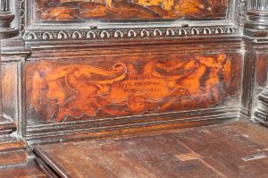 - NOTIZIE STORICO CRITICHE Nel 1522 il Consorzio della Misericordia Maggiore di Bergamo decise di dotare la basilica di Santa Maria di un nuovo coro e il 18 settembre di quell'anno deliberò di trattare con il legnaiolo e intarsiatore loverese Giovanni Francesco Capoferri per l'esecuzione dell'opera. L'artefice era noto a Bergamo fin dall'anno precedente per aver collaborato con fra' Damiano Zambelli all'esecuzione del coro intarsiato nella chiesa domenicana di Santo Stefano (ora in San Bartolomeo), inoltre nel 1522 il pittore Lorenzo Lotto gli aveva fatto tradurre in tarsia un suo disegno dell'Annunciazione (poi inserita nel bancale del celebrante, cfr. foto n. 904a) e questa dimostrazione aveva convinto il Consorzio ad affidare il lavoro al loverese. Al Capoferri, direttore dell'impresa del coro, fu affiancato il marangone Giovanni Belli di Ponteranica per i lavori di intaglio. Il principale teologo della città, fra Girolamo Terzi, fu incaricato di fornire le "inventiones" da dare ai pittori che avrebbero disegnato i cartoni da intarsiare.\nDopo aver acquisito alcuni cartoni forniti da pittori diversi, tra cui Lotto, Andrea Previtali, Francesco Rosso di Pavia, il 29 ottobre 1523 il Consorzio affidò i cartoni delle tarsie del coro al pressoché sconosciuto Nicolino Cabrini, che morì poco dopo. Il 12 marzo 1524 il Consorzio incaricò dunque Lorenzo Lotto di eseguire i disegni per le tarsie e dopo pochi mesi (2 giugno 1524) gli commissionò anche i pannelli intarsiati ("coperti") con imprese simboliche che dovevano proteggere le preziose tavolette. Lotto inizialmente effettuò anche la 'profilatura' delle tarsie, ovvero la loro rifinitura finale mediante stucco nero per i contorni delle figure e con ombreggiatura a fuoco per il chiaro-scuro, ma un contrasto di natura economica frenò la sua disponibilità. La profilatura fu allora effettuata dallo stesso Capoferri e dai pittori Andrea Previtali, Ludovico da Mantova e Lucano da Imola. Trasferitosi a Venezia nel dicembre del 1525, il pittore continuò a disegnare i cartoni delle tarsie e a inviarle a Bergamo fino al 1532, realizzando complessivamente 35 tarsie con storie bibliche di cui 4 grandi per l'iconostasi e 31 più piccole collocate oggi negli stalli del coro dei laici e nei due bancali del presbiterio; inoltre eseguì 32 tarsie a soggetto simbolico delle quali 28 costituivano i "coperti" delle tarsie istoriate e che oggi sono inserite negli schienali del coro degli ecclesiastici. \nNel 1531 si decise di ampliare la struttura del coro, trasferendo le tarsie istoriate del coro degli ecclesiastici al bancale del celebrante, a quello dei Rettori e al coro dei laici nell'abside, mentre nel coro dei religiosi rimasero i soli 'coperti' di soggetto simbolico: dei modelletti delle nuove strutture del presbiterio (bancali e coro dei laici) fu incaricato Marcantonio, figlio dell'architetto Pietro Isabello (1531-1532). Nell'ottobre del 1533, consegnati dal Capoferri gli ultimi pannelli intarsiati, risultano già collocate negli stalli del coro dei religiosi le tarsie 'simboliche' degli ex-coperti, mentre le altre tarsie istoriate rimasero per vent'anni nei depositi della Misericordia Maggiore. La fabbrica del coro fu ripresa nel 1547-1549 ma solo nel 1553-1555 i banchi della cappella maggiore furono portati a termine in base al modello elaborato dall'Isabello: nel 1553 fu chiamato a Bergamo Giovan Pietro Capoferri, fratellastro di Giovan Francesco, affermato intagliatore e intarsiatore, per la realizzazione del bancale del celebrante e della parte sinistra del coro dei laici, mentre ad Alessandro Belli, già attivo col padre nel coro degli ecclesiastici, furono assegnati il bancale dei Rettori e la parte destra del coro dei laici. Nel luglio del 1554 il bancale del celebrante era quasi del tutto intagliato, giacché fu acquistato il noce per la cimasa intagliata da Giovan Pietro Capoferri. Nelle tre spalliere furono inserite sei tarsie disegnate da Lotto e realizzate da Giovan Francesco Capoferri illustranti episodi della