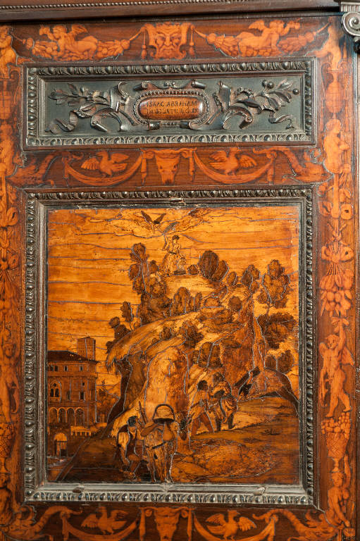 - NOTIZIE STORICO CRITICHE Nel 1522 il Consorzio della Misericordia Maggiore di Bergamo decise di dotare la basilica di Santa Maria di un nuovo coro e il 18 settembre di quell'anno deliberò di trattare con il legnaiolo e intarsiatore loverese Giovanni Francesco Capoferri per l'esecuzione dell'opera. L'artefice era noto a Bergamo fin dall'anno precedente per aver collaborato con fra' Damiano Zambelli all'esecuzione del coro intarsiato nella chiesa domenicana di Santo Stefano (ora in San Bartolomeo), inoltre nel 1522 il pittore Lorenzo Lotto gli aveva fatto tradurre in tarsia un suo disegno dell'Annunciazione (poi inserita nel bancale del celebrante, cfr. foto n. 904a) e questa dimostrazione aveva convinto il Consorzio ad affidare il lavoro al loverese. Al Capoferri, direttore dell'impresa del coro, fu affiancato il marangone Giovanni Belli di Ponteranica per i lavori di intaglio. Il principale teologo della città, fra Girolamo Terzi, fu incaricato di fornire le "inventiones" da dare ai pittori che avrebbero disegnato i cartoni da intarsiare.\nDopo aver acquisito alcuni cartoni forniti da pittori diversi, tra cui Lotto, Andrea Previtali, Francesco Rosso di Pavia, il 29 ottobre 1523 il Consorzio affidò i cartoni delle tarsie del coro al pressoché sconosciuto Nicolino Cabrini, che morì poco dopo. Il 12 marzo 1524 il Consorzio incaricò dunque Lorenzo Lotto di eseguire i disegni per le tarsie e dopo pochi mesi (2 giugno 1524) gli commissionò anche i pannelli intarsiati ("coperti") con imprese simboliche che dovevano proteggere le preziose tavolette. Lotto inizialmente effettuò anche la 'profilatura' delle tarsie, ovvero la loro rifinitura finale mediante stucco nero per i contorni delle figure e con ombreggiatura a fuoco per il chiaro-scuro, ma un contrasto di natura economica frenò la sua disponibilità. La profilatura fu allora effettuata dallo stesso Capoferri e dai pittori Andrea Previtali, Ludovico da Mantova e Lucano da Imola. Trasferitosi a Venezia nel dicembre del 1525, il pittore continuò a disegnare i cartoni delle tarsie e a inviarle a Bergamo fino al 1532, realizzando complessivamente 35 tarsie con storie bibliche di cui 4 grandi per l'iconostasi e 31 più piccole collocate oggi negli stalli del coro dei laici e nei due bancali del presbiterio; inoltre eseguì 32 tarsie a soggetto simbolico delle quali 28 costituivano i "coperti" delle tarsie istoriate e che oggi sono inserite negli schienali del coro degli ecclesiastici. \nNel 1531 si decise di ampliare la struttura del coro, trasferendo le tarsie istoriate del coro degli ecclesiastici al bancale del celebrante, a quello dei Rettori e al coro dei laici nell'abside, mentre nel coro dei religiosi rimasero i soli 'coperti' di soggetto simbolico: dei modelletti delle nuove strutture del presbiterio (bancali e coro dei laici) fu incaricato Marcantonio, figlio dell'architetto Pietro Isabello (1531-1532). Nell'ottobre del 1533, consegnati dal Capoferri gli ultimi pannelli intarsiati, risultano già collocate negli stalli del coro dei religiosi le tarsie 'simboliche' degli ex-coperti, mentre le altre tarsie istoriate rimasero per vent'anni nei depositi della Misericordia Maggiore. La fabbrica del coro fu ripresa nel 1547-1549 con l'incarico di alcuni disegni al pittore Filippo Zanchi e all'intervento dell'intarsiatore Paolo Sabatini da Pesaro e di Giovanni Donato Capoferri, detto Zinino, figlio di Giovan Francesco, che fu limitato però solo ad alcune cornici. Solo negli anni 1553-1555 i banchi della cappella maggiore furono portati a termine in base al modello elaborato dall'Isabello: nel 1553 fu chiamato a Bergamo Giovan Pietro Capoferri, fratellastro di Giovan Francesco, affermato intagliatore e intarsiatore, per la realizzazione del bancale del celebrante e della parte sinistra del coro dei laici, mentre ad Alessandro Belli, già attivo col padre nel coro degli ecclesiastici, furono assegnati il bancale dei Rettori e la parte destra del coro dei laici. Entrambi sono da considerare, oltre che artefici, anch