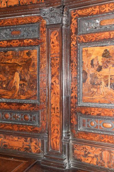 - NOTIZIE STORICO CRITICHE Nel 1522 il Consorzio della Misericordia Maggiore di Bergamo decise di dotare la basilica di Santa Maria di un nuovo coro e il 18 settembre di quell'anno deliberò di trattare con il legnaiolo e intarsiatore loverese Giovanni Francesco Capoferri per l'esecuzione dell'opera. L'artefice era noto a Bergamo fin dall'anno precedente per aver collaborato con fra' Damiano Zambelli all'esecuzione del coro intarsiato nella chiesa domenicana di Santo Stefano (ora in San Bartolomeo), inoltre nel 1522 il pittore Lorenzo Lotto gli aveva fatto tradurre in tarsia un suo disegno dell'Annunciazione (poi inserita nel bancale del celebrante, cfr. foto n. 904a) e questa dimostrazione aveva convinto il Consorzio ad affidare il lavoro al loverese. Al Capoferri, direttore dell'impresa del coro, fu affiancato il marangone Giovanni Belli di Ponteranica per i lavori di intaglio. Il principale teologo della città, fra Girolamo Terzi, fu incaricato di fornire le "inventiones" da dare ai pittori che avrebbero disegnato i cartoni da intarsiare.\nDopo aver acquisito alcuni cartoni forniti da pittori diversi, tra cui Lotto, Andrea Previtali, Francesco Rosso di Pavia, il 29 ottobre 1523 il Consorzio affidò i cartoni delle tarsie del coro al pressoché sconosciuto Nicolino Cabrini, che morì poco dopo. Il 12 marzo 1524 il Consorzio incaricò dunque Lorenzo Lotto di eseguire i disegni per le tarsie e dopo pochi mesi (2 giugno 1524) gli commissionò anche i pannelli intarsiati ("coperti") con imprese simboliche che dovevano proteggere le preziose tavolette. Lotto inizialmente effettuò anche la 'profilatura' delle tarsie, ovvero la loro rifinitura finale mediante stucco nero per i contorni delle figure e con ombreggiatura a fuoco per il chiaro-scuro, ma un contrasto di natura economica frenò la sua disponibilità. La profilatura fu allora effettuata dallo stesso Capoferri e dai pittori Andrea Previtali, Ludovico da Mantova e Lucano da Imola. Trasferitosi a Venezia nel dicembre del 1525, il pittore continuò a disegnare i cartoni delle tarsie e a inviarle a Bergamo fino al 1532, realizzando complessivamente 35 tarsie con storie bibliche di cui 4 grandi per l'iconostasi e 31 più piccole collocate oggi negli stalli del coro dei laici e nei due bancali del presbiterio; inoltre eseguì 32 tarsie a soggetto simbolico delle quali 28 costituivano i "coperti" delle tarsie istoriate e che oggi sono inserite negli schienali del coro degli ecclesiastici. \nNel 1531 si decise di ampliare la struttura del coro, trasferendo le tarsie istoriate del coro degli ecclesiastici al bancale del celebrante, a quello dei Rettori e al coro dei laici nell'abside, mentre nel coro dei religiosi rimasero i soli 'coperti' di soggetto simbolico: dei modelletti delle nuove strutture del presbiterio (bancali e coro dei laici) fu incaricato Marcantonio, figlio dell'architetto Pietro Isabello (1531-1532). Nell'ottobre del 1533, consegnati dal Capoferri gli ultimi pannelli intarsiati, risultano già collocate negli stalli del coro dei religiosi le tarsie 'simboliche' degli ex-coperti, mentre le altre tarsie istoriate rimasero per vent'anni nei depositi della Misericordia Maggiore. La fabbrica del coro fu ripresa nel 1547-1549 con l'incarico di alcuni disegni al pittore Filippo Zanchi e all'intervento dell'intarsiatore Paolo Sabatini da Pesaro e di Giovanni Donato Capoferri, detto Zinino, figlio di Giovan Francesco, che fu limitato però solo ad alcune cornici. Solo negli anni 1553-1555 i banchi della cappella maggiore furono portati a termine in base al modello elaborato dall'Isabello: nel 1553 fu chiamato a Bergamo Giovan Pietro Capoferri, fratellastro di Giovan Francesco, affermato intagliatore e intarsiatore, per la realizzazione del bancale del celebrante e della parte sinistra del coro dei laici, mentre ad Alessandro Belli, già attivo col padre nel coro degli ecclesiastici, furono assegnati il bancale dei Rettori e la parte destra del coro dei laici. Entrambi sono da considerare, oltre che artefici, anch