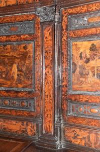 Lesena con capitello in legno intagliato con teoria di foglie di acanto sormontate da foglia; fusto decorato con pannello intarsiato raffigurante elementi decorativi sovrapposti.