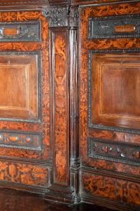 Lesena con capitello in legno intagliato con foglie di acanto e bucrano sormontato da fiore; fusto decorato con pannello intarsiato raffigurante elementi decorativi sovrapposti.