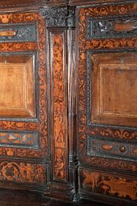 Lesena con capitello in legno intagliato con foglie di acanto e mascherone sormontato da fiore; fusto decorato con pannello intarsiato raffigurante elementi decorativi sovrapposti.
