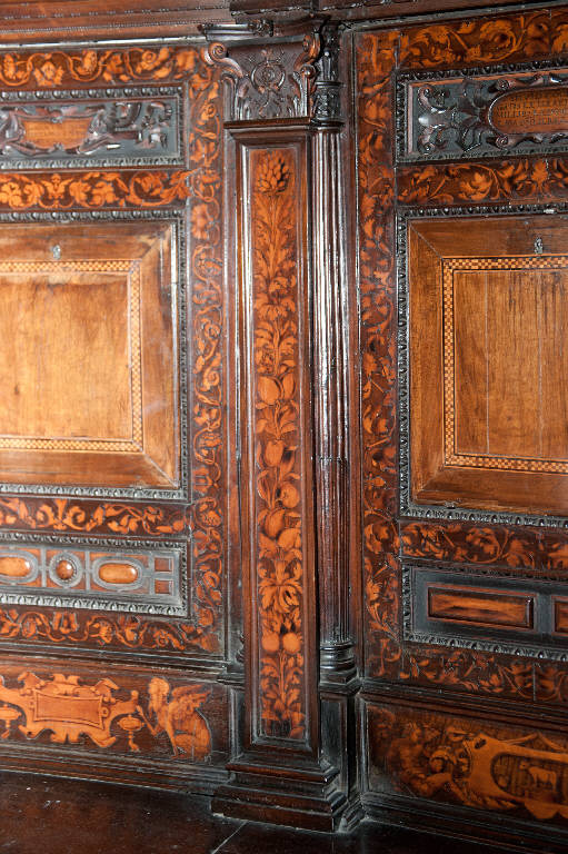 Lesena con capitello in legno intagliato con foglie di acanto, volute e motivo centrale con corni incrociati, tridente e mazza; fusto decorato con pannello intarsiato raffigurante un lungo tralcio di foglie, fiori e frutti.