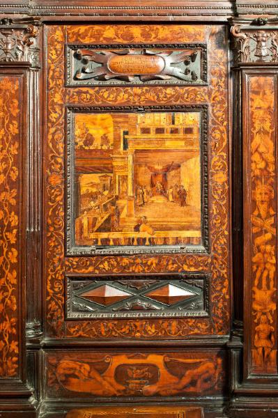 Schienale composto da una cornice intarsiata con mascheroni e girali di foglie, al centro della quale è inserita una tarsia istoriata con "Assalonne, Cusai e Achitofel in consiglio"; superiormente un pannello intagliato con un cartiglio contenente il "titulum" della storia sottostante e inferiormente un pannello intagliato a motivi geometrici; ancora più sotto è inserito un altro pannello intarsiato con un cartiglio avente al centro un drago e sostenuto da nudi maschili; ogni schienale è separato dall'altro da una lesena intarsiata.