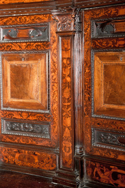 Lesena con capitello in legno intagliato con foglie di acanto, teste di delfino e, al centro, elmo e armi; fusto decorato con pannello intarsiato raffigurante un nudo maschile con suppellettili e insegne ecclesiastiche.