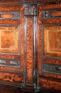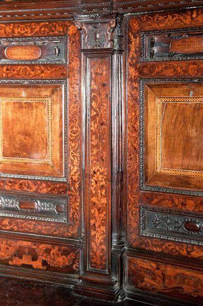 Lesena con capitello in legno intagliato con foglie di acanto, teste di delfino e, al centro, una coppa con alabarde incrociate; fusto decorato con pannello intarsiato raffigurante un tralcio di vite con un uccellino.