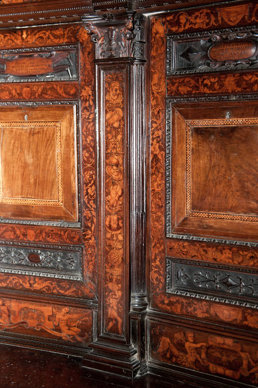 Lesena con capitello in legno intagliato con foglie di acanto, teste di delfino e, al centro, una corazza con lance incrociate; fusto decorato con pannello intarsiato raffigurante un soldato sorreggente un'anfora, strumenti musicali, armi e maschere.