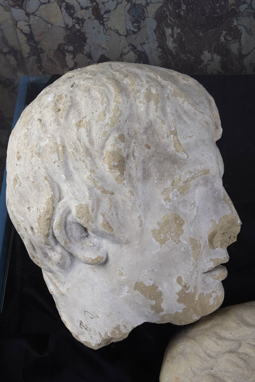 Testa virile, ritratta di profilo e rivolta verso destra; capelli corti e mossi, bocca socchiusa.