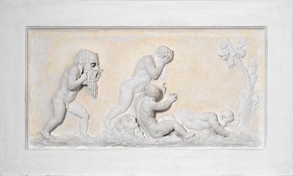 - NOTIZIE STORICO CRITICHE Il pannello decorativo fa parte di una serie di sei sovrapporte in rilievo attribuite a Camillo Pacetti, realizzate tra gli ultimi anni del suo soggiorno romano e i primi di quello milanese. Già menzionate nell'inventario Sommariva, ciascuna sovrapporta raffigura scherzi di putti e fauni.