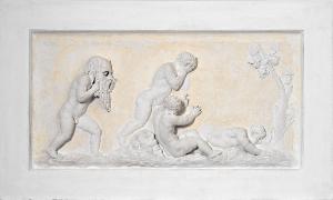 Gruppo di quattro putti. A sinistra un putto stante con indosso una maschera tragica; al centro un putto stante si copre il volto con le mani, un altro è seduto di schiena e un ultimo è raffigurato di lato e prono. A destra un tralcio di vite.