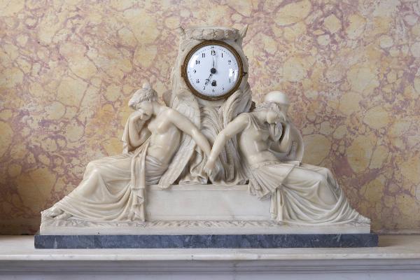 - NOTIZIE STORICO CRITICHE Durante il primo decennio dell'Ottocento Pietro Fontana partecipa più volte alle esposizioni milanesi di Brera. Probabilmente è in queste occasioni che Giovanni Battista Sommariva si avvicina allo scultore carrarese e gli commissiona alcune opere per la sua collezione tra cui questo orologio da mensola, singolare per la sua tematica allegorica allusiva alla Pace. Pietro Fontana figura tra i migliori allievi scultori di Brera ed è vincitore del pensionato romano, dopo il quale espone a Brera negli anni 1807, 1808, 1810, 1816.
