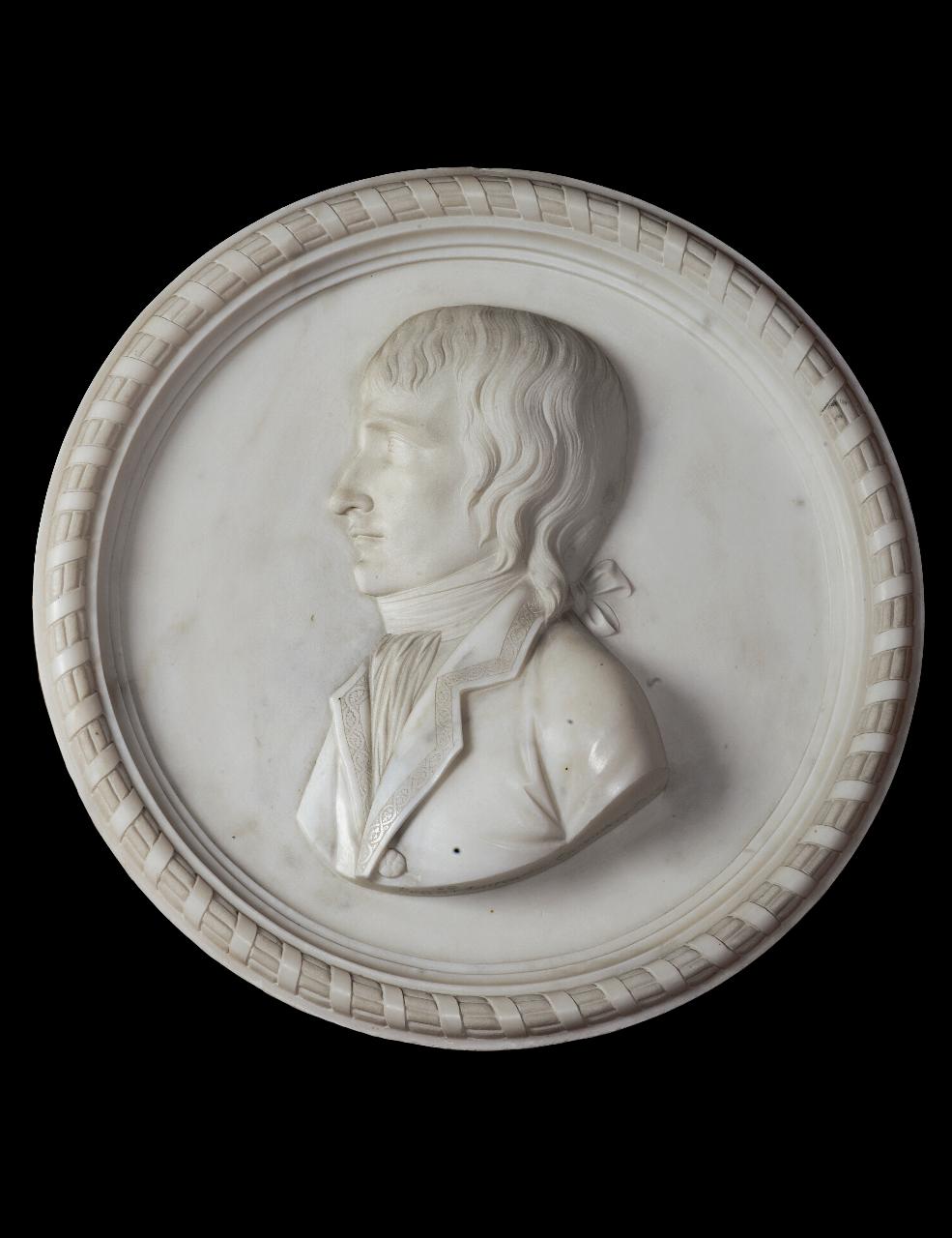 - NOTIZIE STORICO CRITICHE Si tratta di un singolare esempio di ritrattistica napoleonica. Il medaglione rappresenta il profilo di un giovane Napoleone ritratto in abiti civili. La sua presenza nella collezione di Giovanni Battista Sommariva testimonia la grande fascinazione del mecenate per Bonaparte che incoraggiò la sua fulminea quanto breve carriera politica. Di ottima fattura, è una delle rarissime opere note di Francesco Lazzarini.