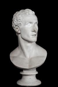 Busto maschile ripreso di tre quarti, con bocca socchiusa e capelli mossi, corti.