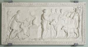 A sinistra: figura maschile stante in abiti militari romani ritratta nell'atto di uccidere un capretto; nella mano destra regge un pugnale. Dietro di lui tre figure maschili, in abiti militari con indosso un elmo e lance in mano. Al centro: ara fumante, dietro la quale compare una figura femminile, chinata in avanti, con le mani protese verso il capretto. A destra: gruppo di quattro persone stanti, di cui una femminile, di profilo con indosso una tunica e in mano una ciotola dalla quale cade dell'acqua. Dopo di lei tre figure maschili, con il capo cinto d'alloro e in mano dei libri. Davanti a loro un toro e un agnellino, seguiti da altri quattro tori.