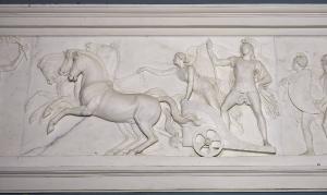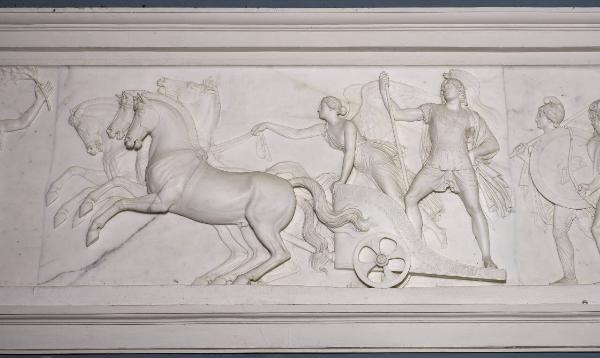 - NOTIZIE STORICO CRITICHE Si tratta di una delle trentatré lastre di cui si compone il grandioso fregio con “L'ingresso di Alessandro Magno in Babilonia” che Bertel Thorvaldsen esegue in marmo per Giovanni Battista Sommariva tra il 1818 e il 1828 e che risulta allestito nel Salone della villa di Tremezzo nel 1829, dunque solo in seguito alla scomparsa del committente. Una prima versione in stucco del fregio risale al 1812 ed è quella modellata dallo scultore per il Palazzo del Quirinale a Roma a celebrazione del pacifico ingresso nell’Urbe di Napoleone. La versione di Villa Carlotta è la sua traduzione in marmo in scala monumentale in principio commissionata a Thorvaldsen da Bonaparte e destinata al Temple de la Gloire di Parigi. Con la caduta di Napoleone la commissione venne rilevata da Sommariva che ne richiese il completamente per la sua villa di Tremezzo. Successive sono invece le due repliche romane, quella in marmo per Palazzo Torlonia e quella in gesso per il Casino di Villa Torlonia, e la versione eseguita in marmo per Christiansborg a Copenhagen.