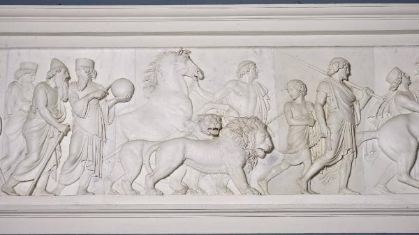- NOTIZIE STORICO CRITICHE Si tratta di una delle trentatré lastre di cui si compone il grandioso fregio con “L'ingresso di Alessandro Magno in Babilonia” che Bertel Thorvaldsen esegue in marmo per Giovanni Battista Sommariva tra il 1818 e il 1828 e che risulta allestito nel Salone della villa di Tremezzo nel 1829, dunque solo in seguito alla scomparsa del committente. Una prima versione in stucco del fregio risale al 1812 ed è quella modellata dallo scultore per il Palazzo del Quirinale a Roma a celebrazione del pacifico ingresso nell’Urbe di Napoleone. La versione di Villa Carlotta è la sua traduzione in marmo in scala monumentale in principio commissionata a Thorvaldsen da Bonaparte e destinata al Temple de la Gloire di Parigi. Con la caduta di Napoleone la commissione venne rilevata da Sommariva che ne richiese il completamente per la sua villa di Tremezzo. Successive sono invece le due repliche romane, quella in marmo per Palazzo Torlonia e quella in gesso per il Casino di Villa Torlonia, e la versione eseguita in marmo per Christiansborg a Copenhagen.