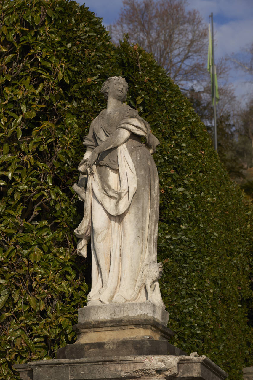 Figura femminile stante drappeggiata in un'ampia tunica, tenuta nella mano sinistra; volto rivolto a destra e cappelli raccolti. Accanto al piede sinistro un uccello acefalo.