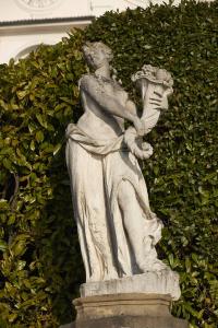 - NOTIZIE STORICO CRITICHE Si tratta di una delle dodici sculture che ornano la balaustra d'ingresso della villa che risultano documentate già nel XVIII secolo, come attestano le incisioni pubblicate da Marc' Antonio Dal Re nel volume "Ville di Delizia" (1743). Tuttavia, la resa grafica delle stampe non consente un'identificazione certa e inequivocabile con le statue attualmente in loco (Zanuso 2019). Per caratteri stilistici, le opere sono attribuibili allo scultore padovano Antonio Bonazza, assistito dalla sua bottega. L'iscrizione in lettere capitali incisa sul basamento consente di identificarla con "Pomona". Questa figura rientra nelle rappresentazioni mitologiche presenti nella serie (Zanuso 2019).