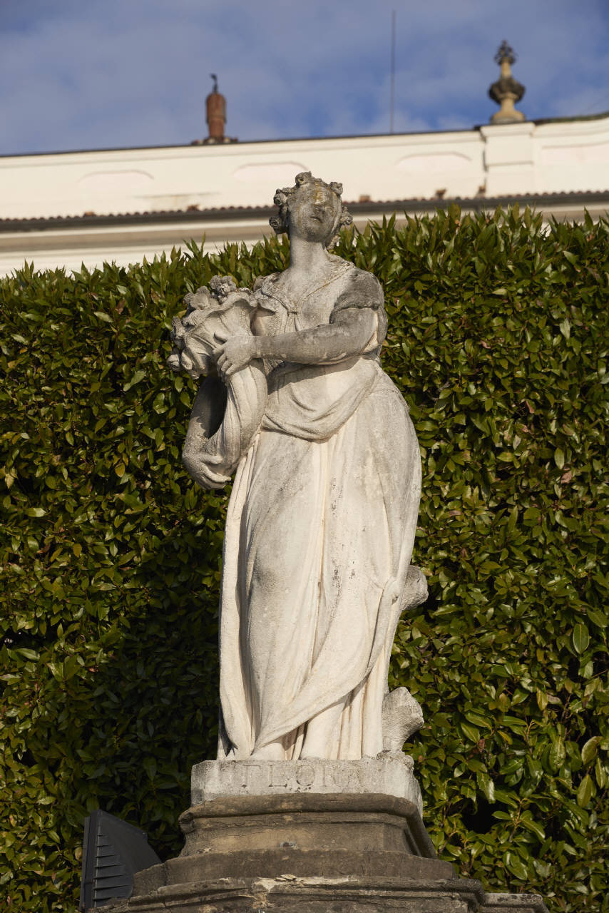 - NOTIZIE STORICO CRITICHE Si tratta di una delle dodici sculture che ornano la balaustra d'ingresso della villa che risultano documentate già nel XVIII secolo, come attestano le incisioni pubblicate da Marc' Antonio Dal Re nel volume "Ville di Delizia" (1743). Tuttavia, la resa grafica delle stampe non consente un'identificazione certa e inequivocabile con le statue attualmente in loco (Zanuso 2019). Per caratteri stilistici, le opere sono attribuibili allo scultore padovano Antonio Bonazza, assistito dalla sua bottega. L'iscrizione in lettere capitali incisa sul basamento consente di identificarla con "Flora". Questa figura rientra nelle rappresentazioni mitologiche presenti nella serie (Zanuso 2019).