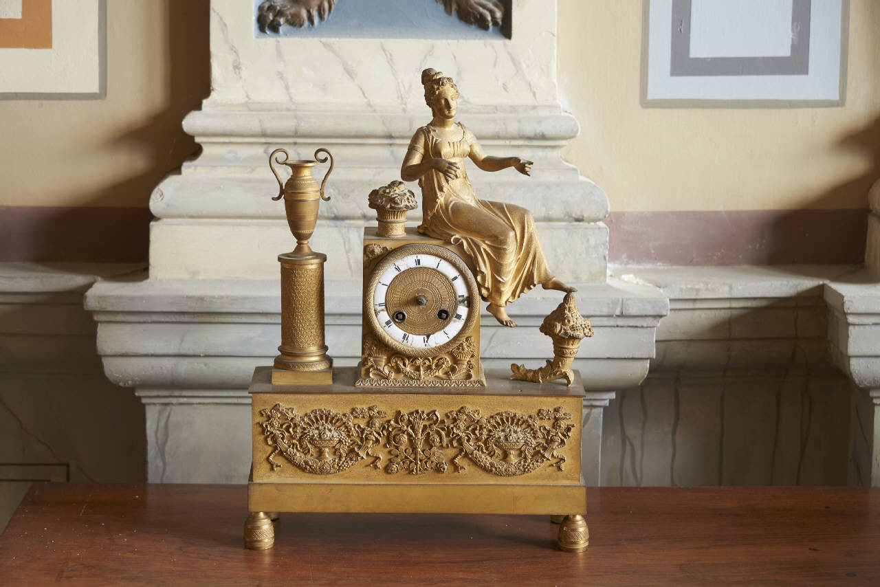 Figura femminile, voltata verso destra e seduta sopra il quadrante con decorazioni floreali. Porta capelli raccolti sopra la nuca e una tunica a maniche corte panneggiata. Il piede sinistro poggia sopra una cornucopia piena di fiori e frutta. Accanto a lei una colonnina su cui è poggiata un'anfora con anse.