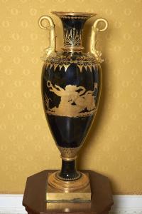 - NOTIZIE STORICO CRITICHE Questa coppia di vasi è documentata essere parte dell'arredo di Palazzo Reale di Milano, già nel 1909, all'interno della Sala delle Colonne. La forma del vaso, ideata da Théodore Brongniart (inventore delle nuove forme neoclassiche della Manifattura di Sèvres in età napoleonica) è chiamata "a fuseaux" ed è usata per la produzione di solo undici vasi imperiali, restando poi nella produzione per tutto l'Ottocento. La dimensione dei vasi conservati in Villa Carlotta è considerata la "prima grandezza" nel repertorio de la Manifattura di Sèvres, anche se diversi elementi portano ad allontanarli dalla manifattura imperiale; per cominciare non porta la marca di fabbrica e mostra difetti: la forma ovoidale ha visibile a luce radente il passaggio di piano degli stampi, ha diversi difetti sulle spalle con medaglie di inaderenza dello smalto in prima cottura (poi coperte dal colore). Il classico gioco cromatico di reazione negli smalti di Sèvres che crea con scivolamenti irregolari un "effetto pietra dura" non è riuscito. Si tratta quindi di una porcellana prodotta a imitazione della manifattura imperiale e databile tra il 1820 e il 1830.\nRégine de Plinval de Guillebon (massima esperta di Porcelaines de Paris) consiglia di assegnarlo (con incertezza critica) alla manifattura parigina di Pierre Louis Dagoty, datandolo al 1815 circa. \nLa manifattura, un piccolo atelier di fini decoratori, venne fondata in età rivoluzionaria da tre fratelli, Pierre Louis, Isidore e Etienne Dagoty. Dal 1804 Pierre Louis, ne diventa unico proprietario, ed eleva la qualità materica ed artistica della produzione raggiungendo la clientela imperiale. Dal 1804 al 1814 potrà portare il titolo di "Manufacture de S.M. L'Imperatrice" e, dopo la caduta dell'Impero, "di Madame la Duchesse d'Angouleme." Dal 1810 al 1820 si associa con Francois Maurice Honoré aggiungendo la sede produttiva delle forme di Saint-Yrieix, vicino a Limoges, a quella parigina dedicata alla decorazione pittorica.
