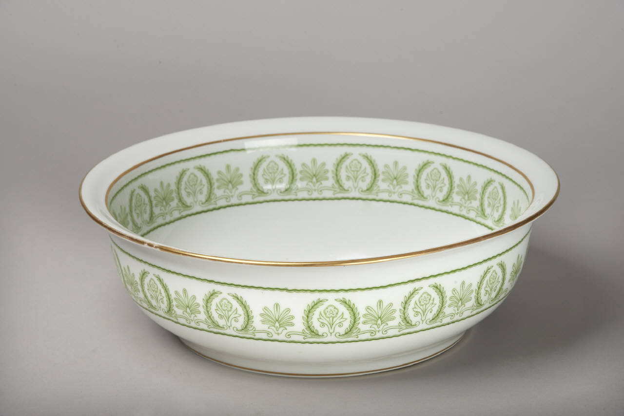 Catino in porcellana industriale a parete liscia, spessa, leggermente beigiata, con un decoro a nastro in decalcomania dal disegno in color verde pisello composto con motivi floreali e fogliati geometricamente stilizzati. Gli orli sono profilati in oro. Impostato su base ad anello, parete liscia dall'orlo estroflesso carenato all'interno.