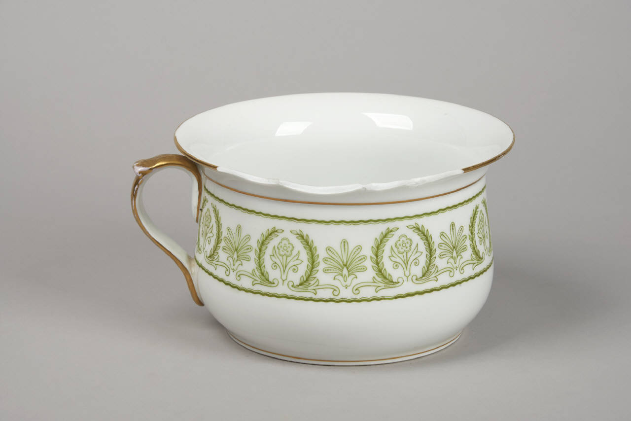 Vaso da notte in porcellana industriale a parete liscia, spessa, leggermente beigiata, con un decoro a nastro in decalcomania dal disegno in color verde pisello composto con motivi floreali e fogliati geometricamente stilizzati. Gli orli sono profilati in oro. Ha il corpo dal calice rigonfio e orlo estroflesso; ansa a nastro leggermente rigonfia.