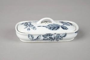Portaspazzolino a vaschetta, con due sottili elementi fissi orizzontali per poggiare spazzolini all'interno; ha coperchio traforato al centro sotto l'ansa. Decoro a decalcomania in monocromia blu con grandi fiori dal disegno stilizzato e lunghe foglie; sono presenti anche mazzetti floreali secondari.