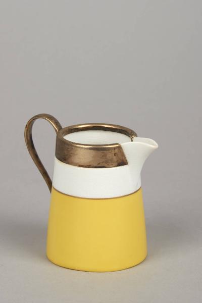 Il corpo della lattiera è a tronco di cono; semplici fasce metalliche profilano, proteggendoli, alcuni orli superiori del materiale ceramico, così come il manico.