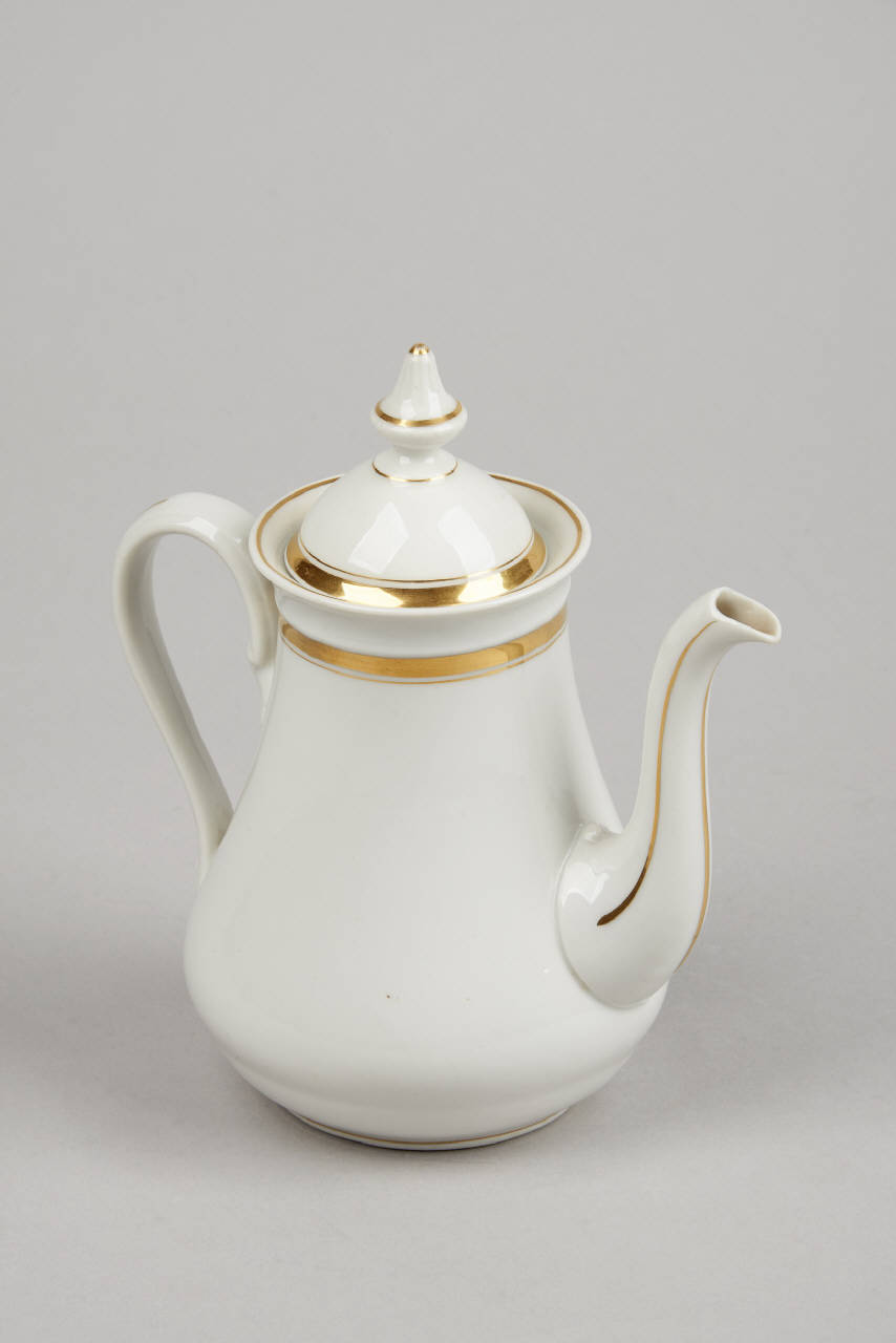 Caffettiera con decorazione riservata a filetto e sottile fascia in monocromia oro.